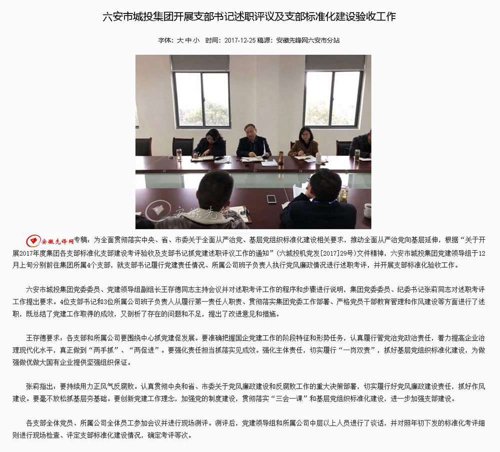 【安徽先锋网】六安市城投集团开展支部书记述职评议及支部标准化建设验收工作
