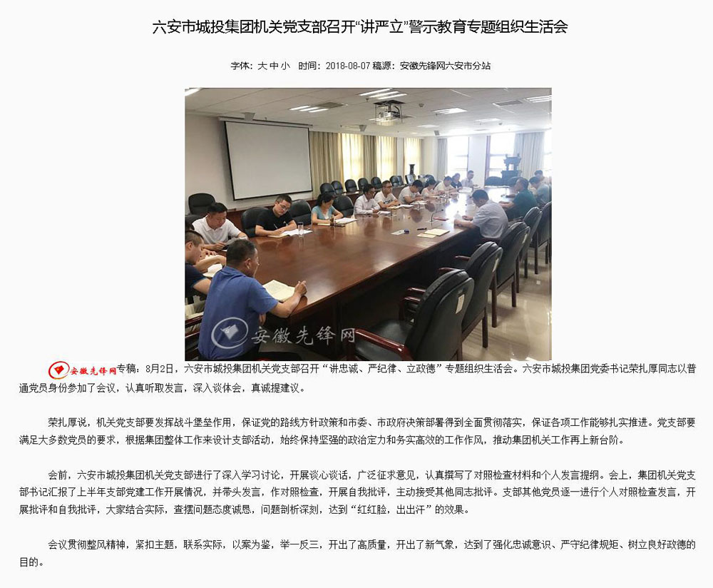 【安徽先锋网】六安市城投集团机关党支部召开“讲严立”警示教育专题组织生活