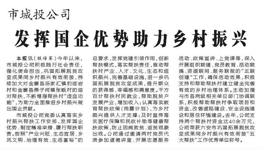 【皖西日报】市城投公司:发挥国企优势助力乡村振兴