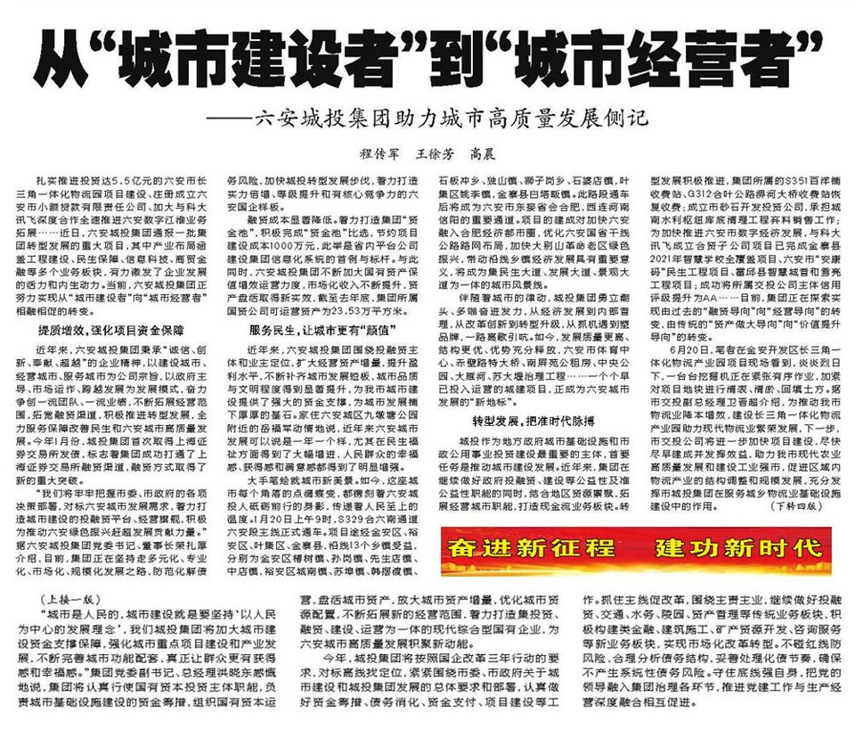 【皖西日报】六安城投集团创历史同类债券发行最低价格